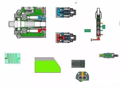 除了常規的柱塞泵缸體柱塞等主泵的元件外,它還集成了一個補油泵、補油壓力溢流閥、補油單向閥、兩個高壓溢流閥、一個壓力切斷閥和變量機構等。